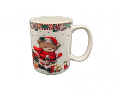 Vánoční hrnek s medvídkem a dárky. Objem 370 ml. Výška 9,8 cm, průměr 8 cm. Vyroben z keramiky. Skvělý pro vánoční nápoje a jako dárek.