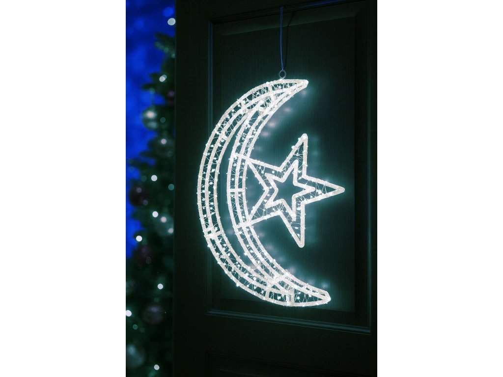 Tento elegantní LED vánoční měsíc – svítící dekorace, 45 cm, studená bílá je ideální ozdobou pro váš domov i venkovní prostory. Pevná plastová konstrukce je omotaná mikro LED řetězem s 800 diodami, které vyzařují jasné studené bílé světlo a vytvářejí nádherný sváteční efekt.