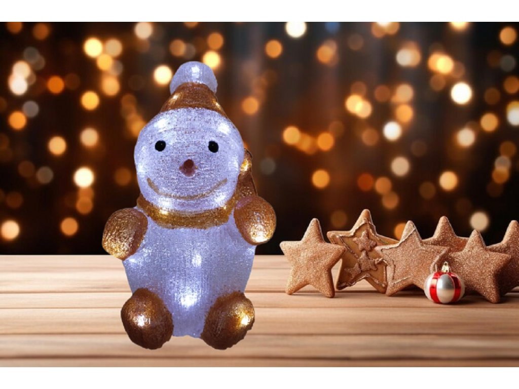 Tento akrylový sněhulák o výšce 27 cm a šířce 14 cm přináší úchvatnou atmosféru do vašeho interiéru. S hnědo-bílým designem a 140cm dlouhým přívodním kabelem je sněhulák elegantním vánočním doplňkem. Díky stále svítícím LED diodám a ochranou IP20 je ideální pro vnitřní použití.