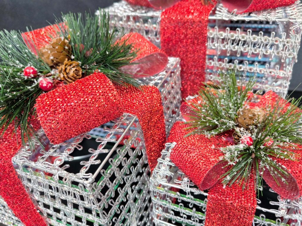 Elegantní sada svítících vánočních dárkových boxů dodá vašemu domovu kouzelnou atmosféru Vánoc. Boxy jsou vyrobené z pevné konstrukce, omotané mikro LED řetězem, který září jasným studeným bílým světlem. Dekoraci doplňuje červená třpytivá mašle a přízdoba z větviček, bobulek a malých šišek – díky tomu působí boxy luxusně a slavnostně.