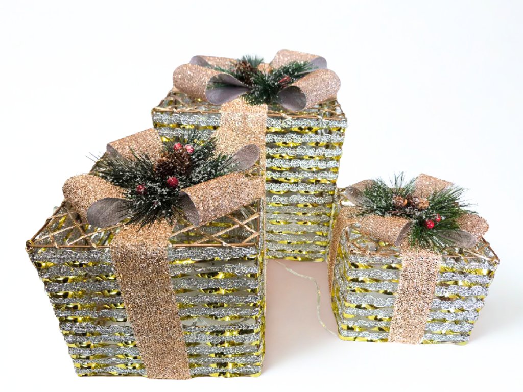 Luxusní sada 3 svítících vánočních krabic v originálním provedení – stříbrná konstrukce doplněná měděně zlatou mašlí a přírodní ozdobou (větvičky, bobule, šišky).