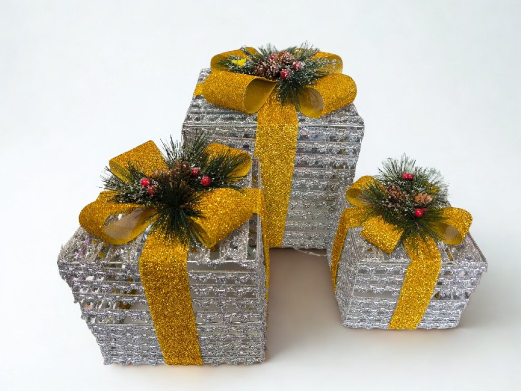 Elegantní sada 3 svítících vánočních krabic v kombinaci stříbrné konstrukce a zlaté mašle vnese do vašeho domova slavnostní atmosféru. Zabudovaná LED světýlka s teplou bílou barvou vytvářejí útulný a luxusní efekt.