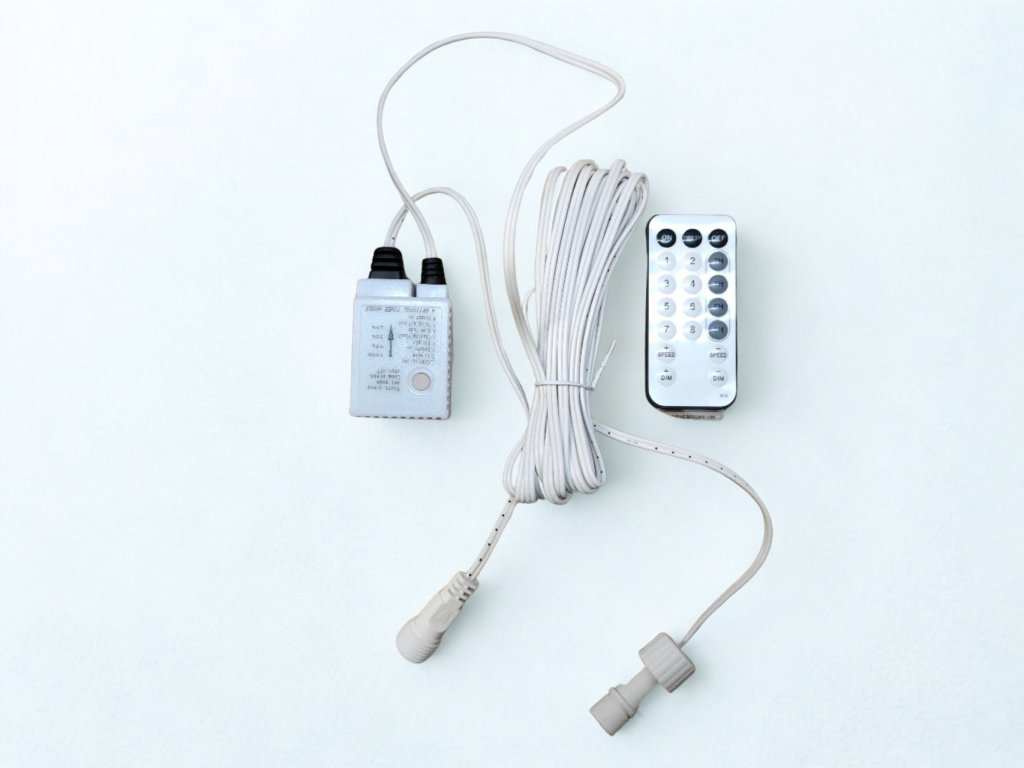 Řídicí jednotka pro vánoční světelné závěsy umožňuje dálkové ovládání světelných režimů a pohodlné zapínání a vypínání osvětlení bez nutnosti manipulace u kabelu.