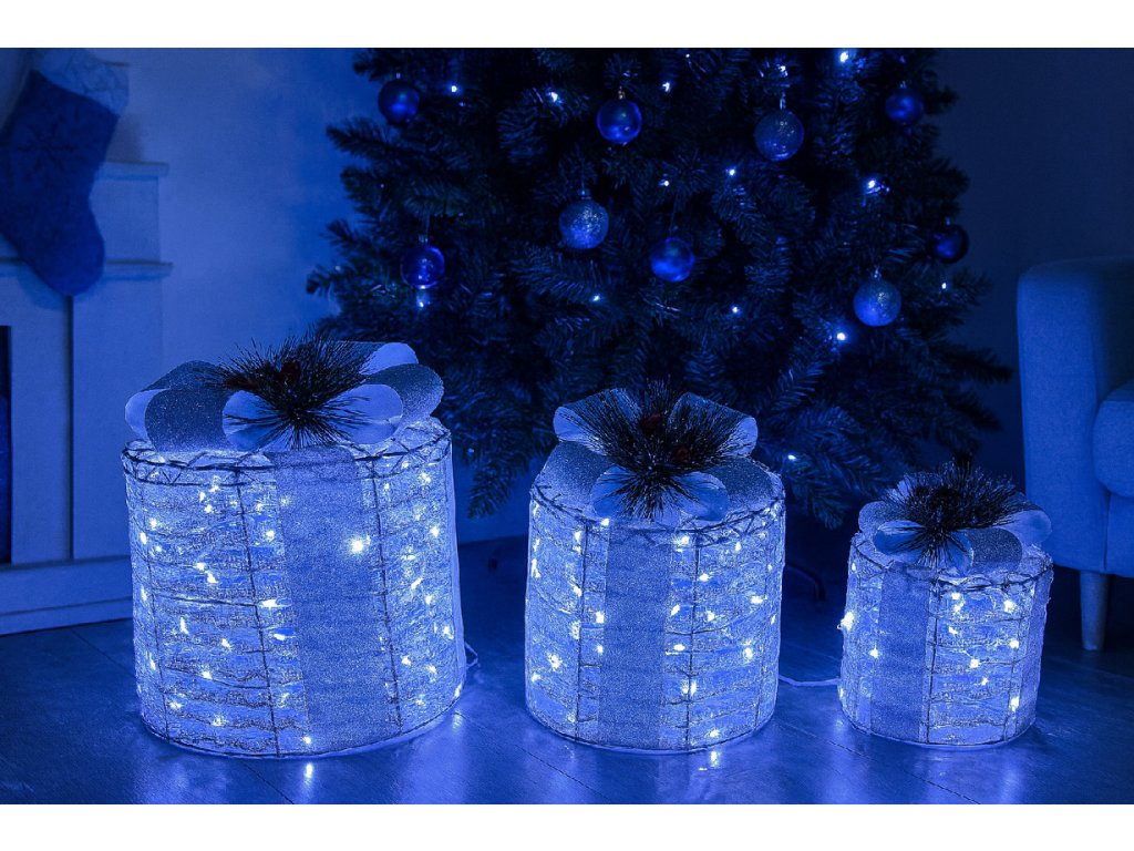 Elegantní sada tří vánočních dárků ve tvaru válce s LED osvětlením ve studené bílé barvě vytvoří útulnou a slavnostní atmosféru. Stříbrný povrch s jemnou síťovinou, ozdobnou mašlí a vánoční dekorací působí luxusně a rozzáří každý interiér. Díky třem velikostem je můžete postavit společně jako sadu nebo rozmístit samostatně. Skvěle se hodí pod vánoční stromeček, do obývacího pokoje, vstupní haly nebo výlohy.