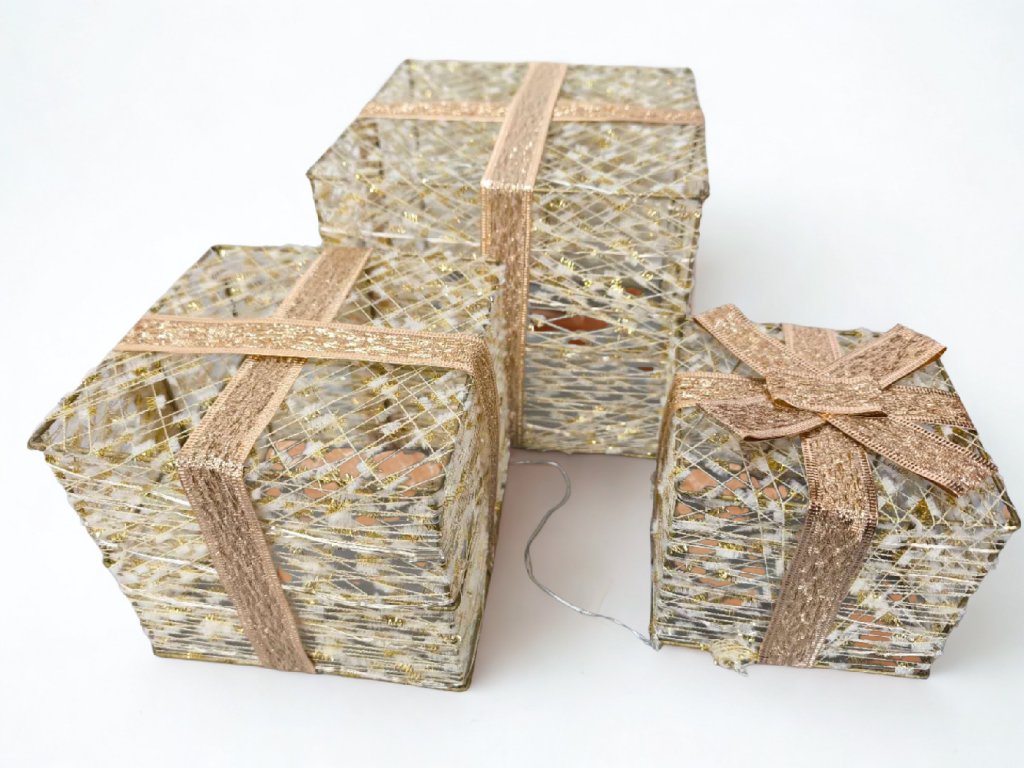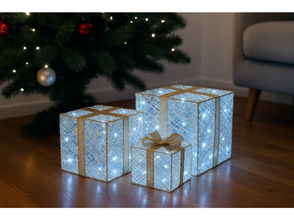Svítící LED dekorace – dárky s ozdobou, zlatá stuha, 3 velikosti, studená bílá