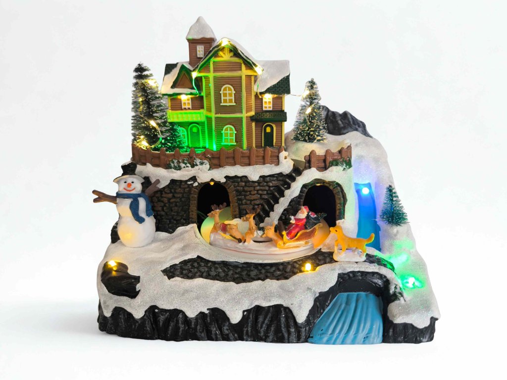 Scéna zachycuje zasněžený domek s barevným LED osvětlením, veselého sněhuláka, a hlavně Santu na saních tažených soby, kteří se opravdu pohybují tunelem skrz horu.