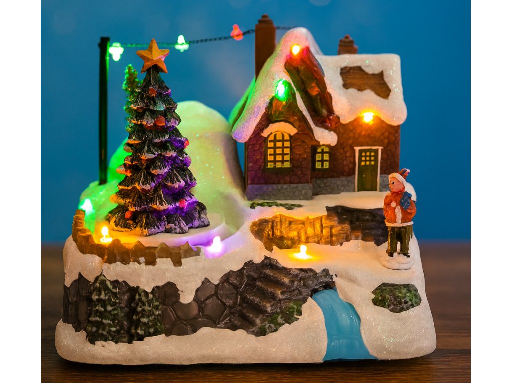 Tato kouzelná vánoční dekorace přináší do vašeho domova atmosféru zasněžené vesničky s rozsvícenými domečky, světélkujícím stromkem a postavičkou v zimním oblečení. Barevné LED diody jemně prosvěcují celý motiv a vytvářejí útulnou sváteční náladu. Stromek se pomalu otáčí a díky možnosti přehrávání vánočních melodií je tato dekorace dokonalým doplňkem pro adventní období.