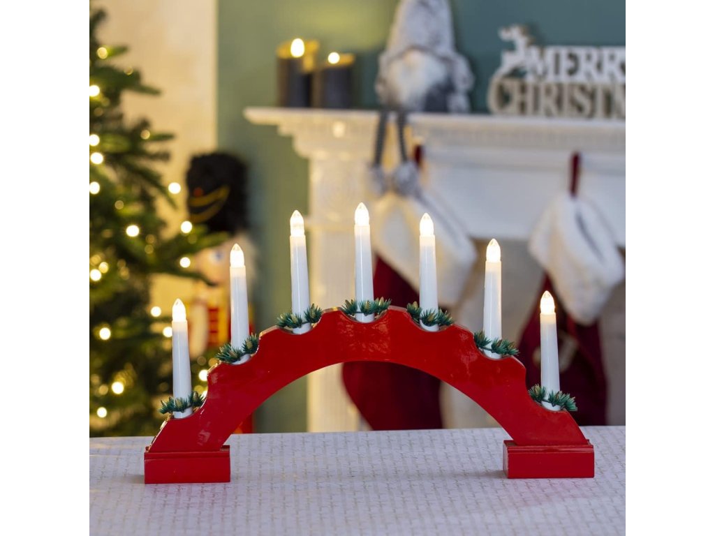 Vánoční dřevěný svícen ve tvaru oblouku, červená, 7 svíček, teplá bílá, na baterie