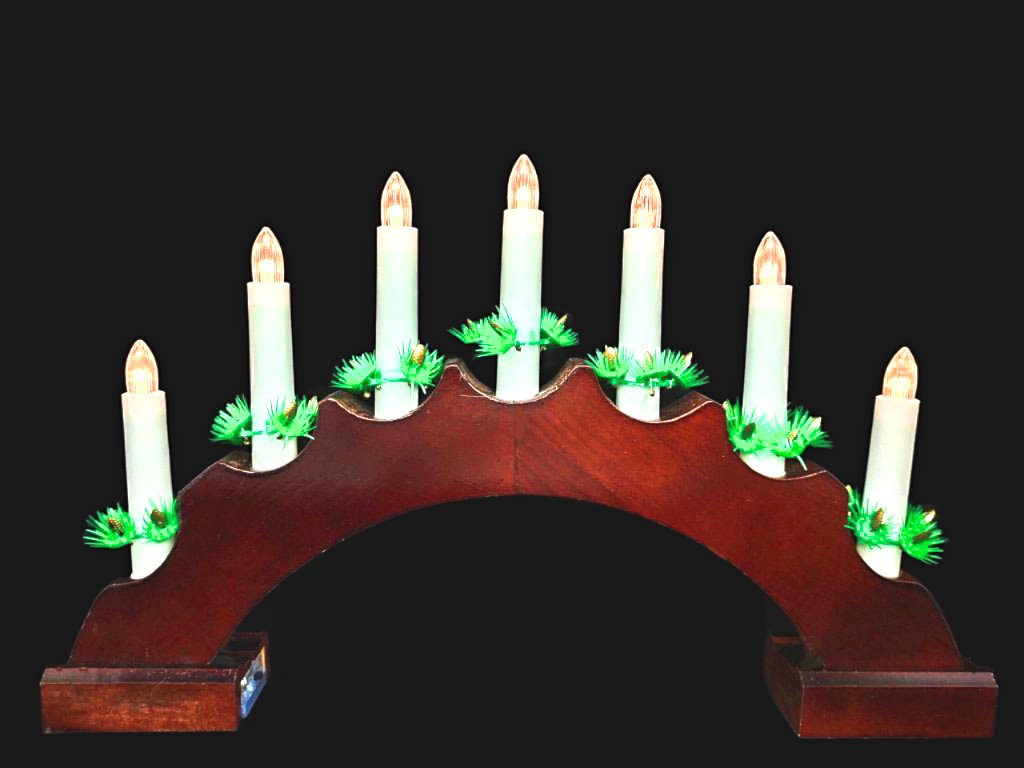 Vánoční dřevěný svícen ve tvaru oblouku na baterie – vínový, 7 svíček, teplá bílá