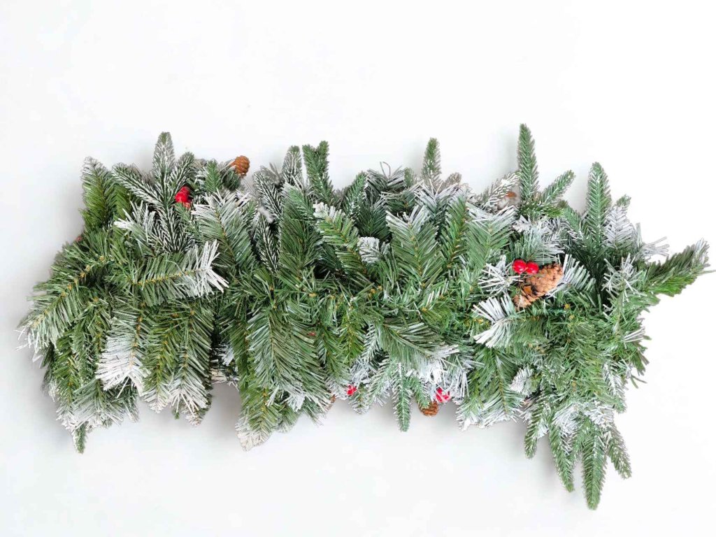 Vytvořte si dokonalou vánoční atmosféru s touto bohatou girlandou z umělého jehličí o délce 2,7 metru a šířce 35 cm. Girlanda je zdobená realistickými šiškami a červenými bobulemi, které dodají interiéru i exteriéru tradiční sváteční vzhled.