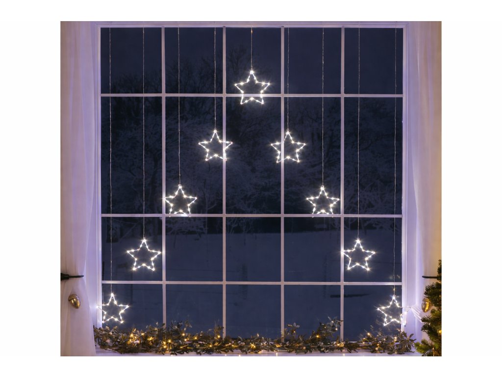 Tento světelný LED závěs s 9 hvězdami postavenými vedle sebe v obráceném V a délkou světelné části 130 cm je okouzlujícím doplňkem pro vaše prostředí. Každá z 9 závěsných hvězd je osvícena 90 mikro LED diodami, což vytváří krásný efekt. Světelný závěs nabízí pouze stálé svícení, má výšku nejdelšího pramene 75 cm a rozestupy mezi prameny činí 16 cm. S krytím IP44 je vhodný i pro venkovní použití.