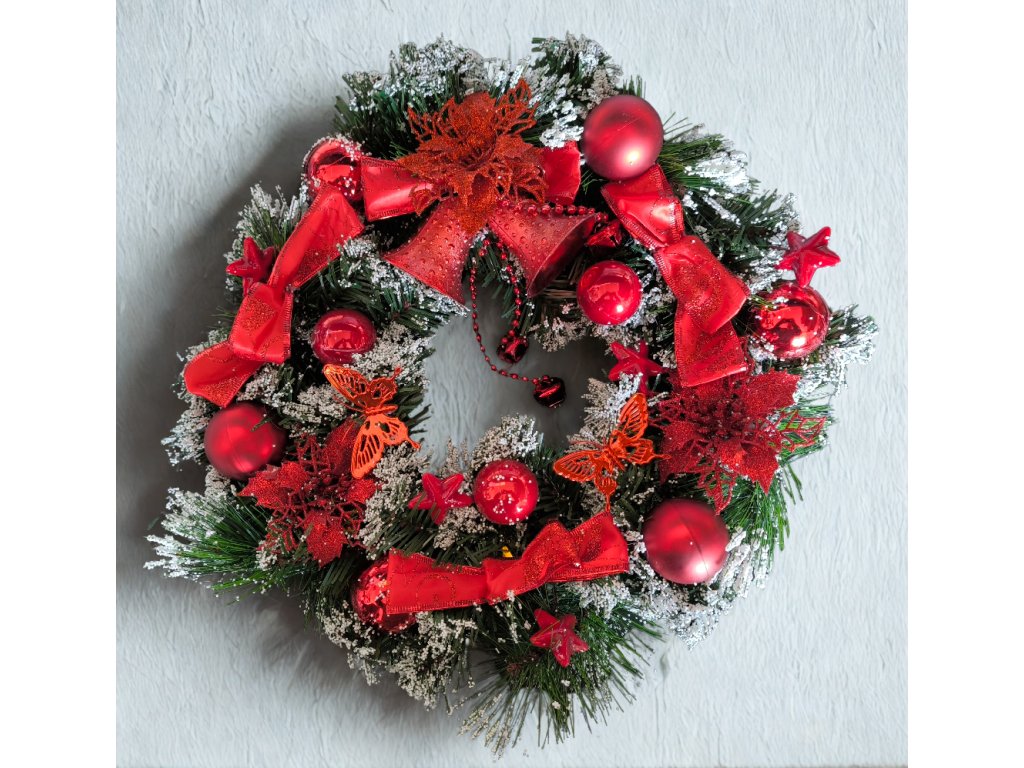 Tradiční vánoční věnec o průměru 40 cm je krásnou volbou pro všechny, kteří milují klasickou červenou vánoční výzdobu. Husté zelené větvičky jsou bohatě posypané efektem umělého sněhu a zdobené výraznými červenými koulemi, mašlemi, hvězdami, třpytivými květy a jemnými detaily, jako jsou ozdobní motýlci. Celkový vzhled podtrhuje elegantní zvonek s květinovou dekorací uprostřed.