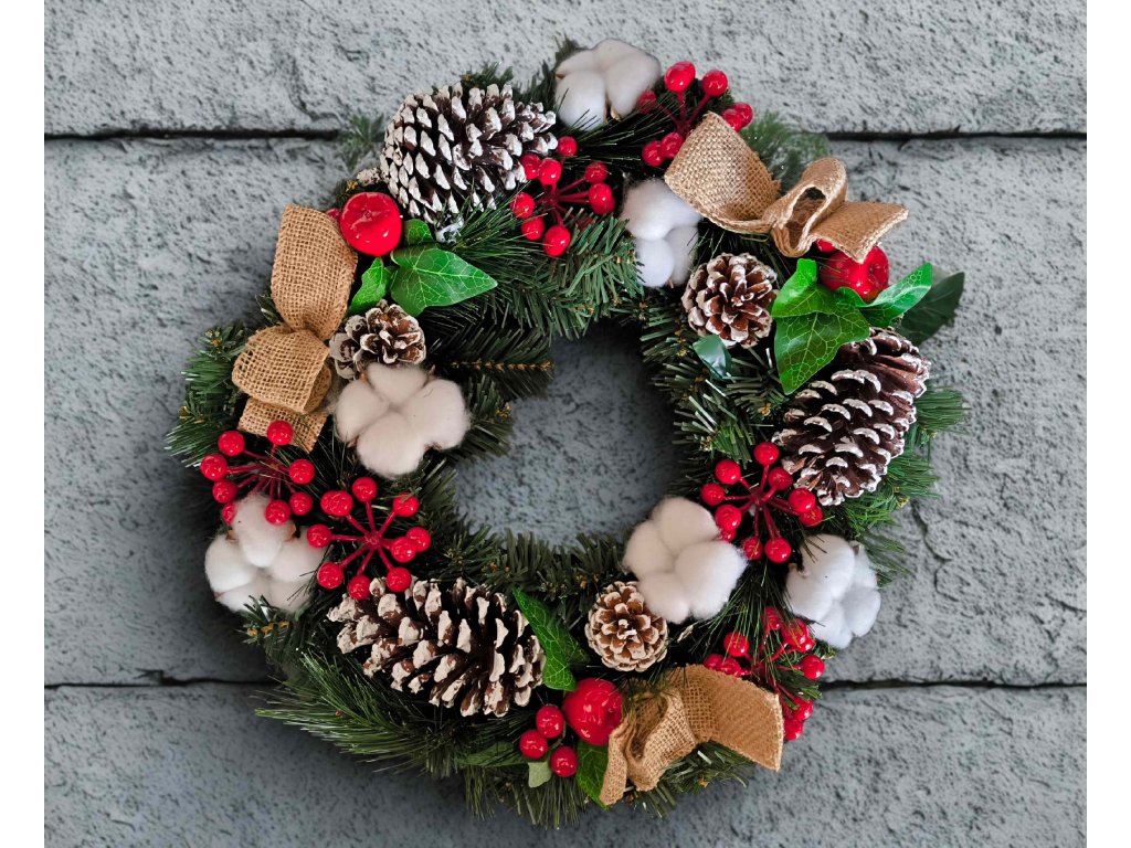 Vánoční věnec na dveře s přírodními šiškami, bavlnou a jutovou mašlí, 40 cm