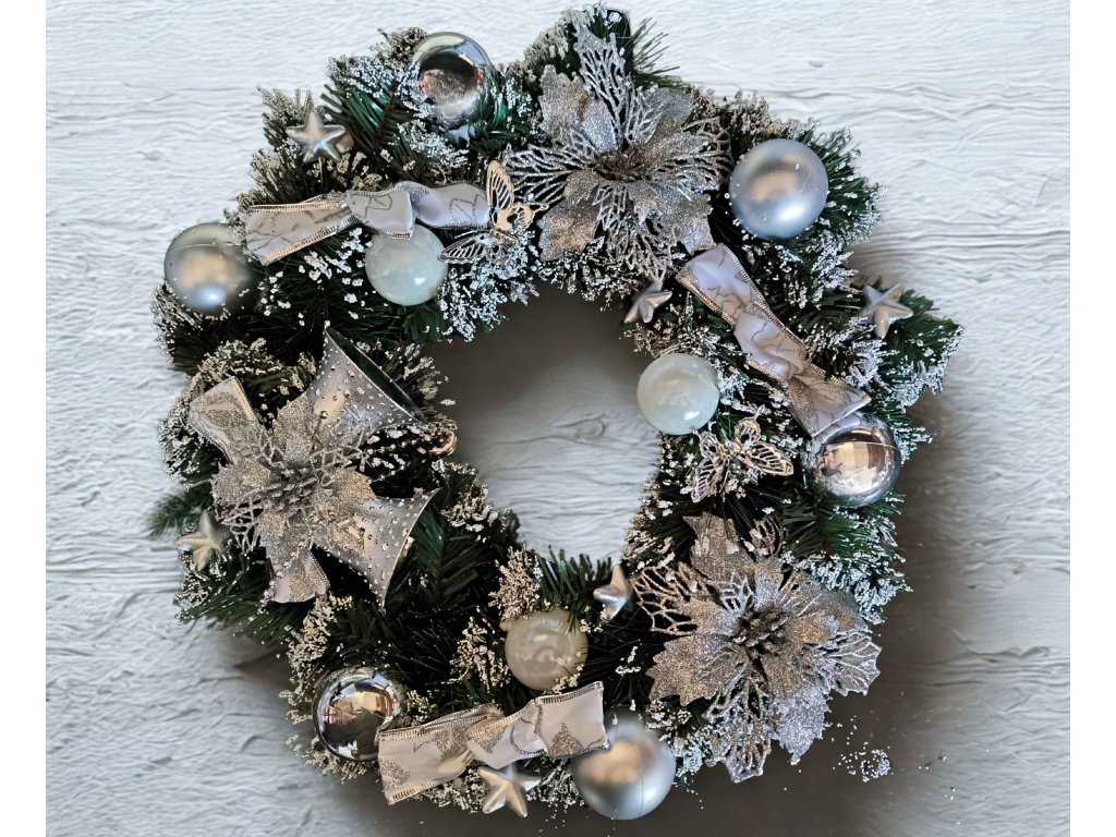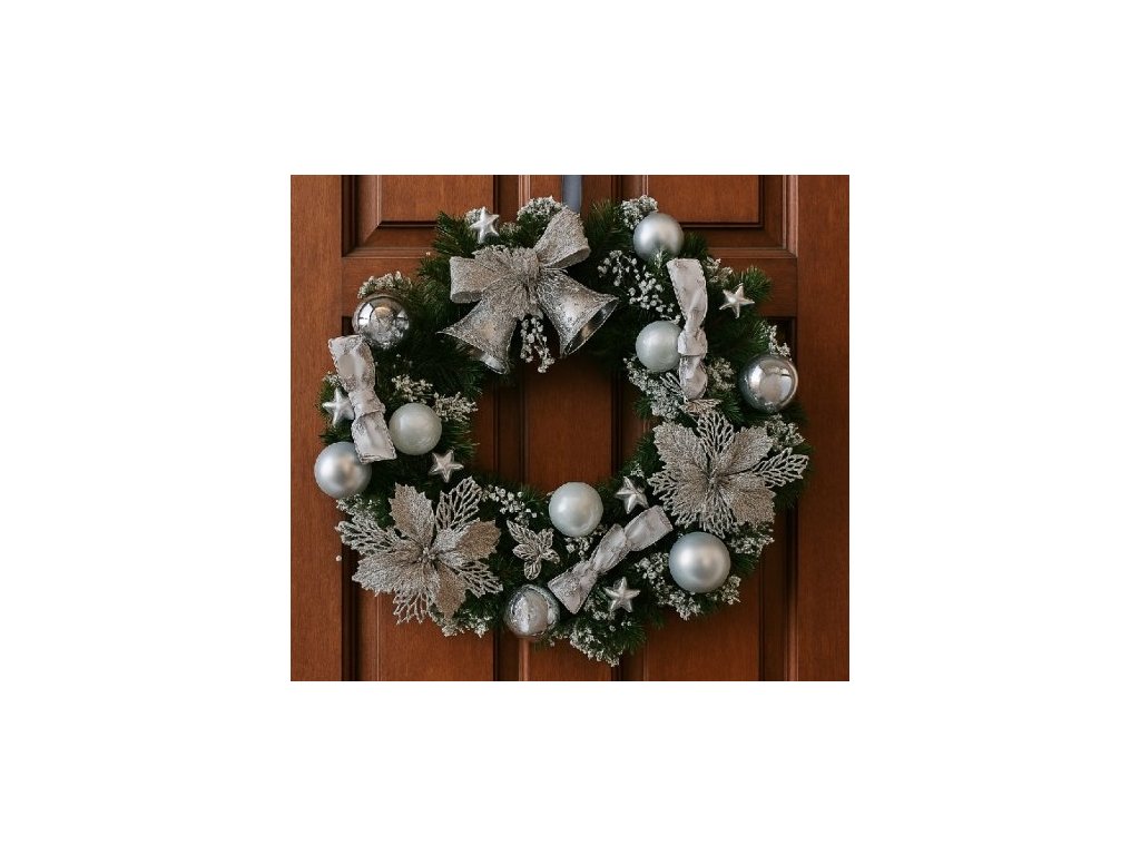 Elegantní vánoční věnec o průměru 50 cm ozdobí vaše vchodové dveře, stěnu nebo interiér a vnese do domova slavnostní atmosféru. Husté zelené jehličí je doplněno o efekt umělého sněhu, který vytváří zimní vzhled. Stříbrné ozdoby v podobě květů, hvězd, mašlí, zvonků a vánočních koulí dodávají věnci luxusní charakter a dokonale ladí s moderní i klasickou výzdobou.