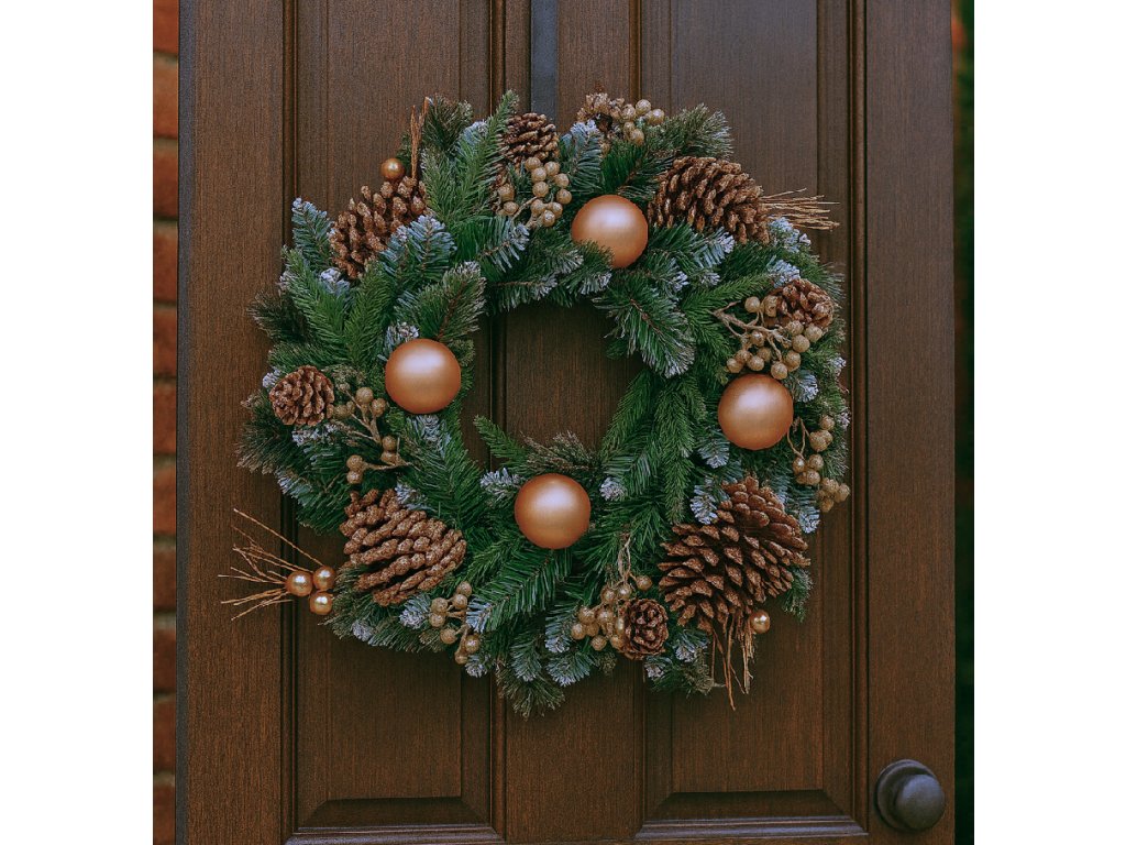 - Průměr: 50 cm Materiál: PVC jehličí + přírodní šišky + plastové ozdoby