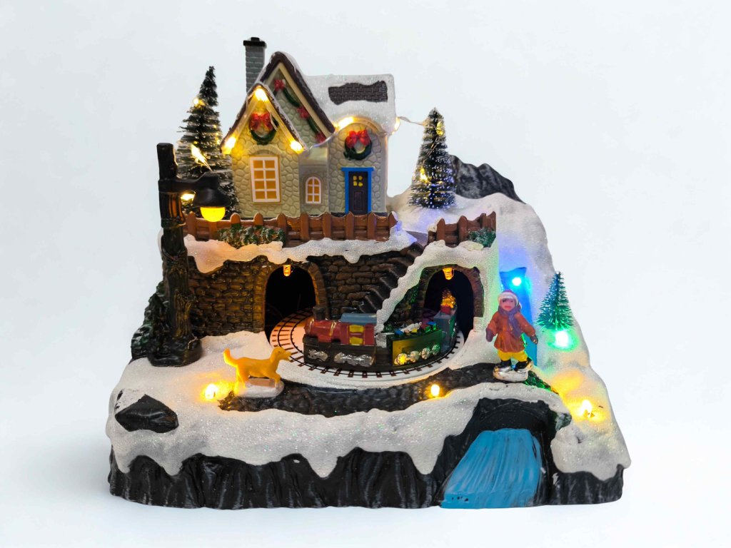 Kouzelná vánoční dekorace s detailně propracovaným domečkem, svítícími stromečky a vláčkem, který projíždí tunelem. Barevné LED diody a vánoční melodie vytvoří dokonalou sváteční atmosféru ve vašem domově.